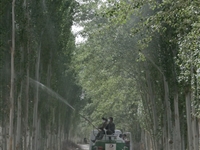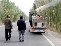 随着天气转暖,农田防护林木春尺蠖虫害幼虫已达到孵化盛期。为做好防治病虫害,保护全县林木生长安全,该县各乡林业站在县森防站技术人员的指导下,于4月18日开始出动防治车2辆,投入工作人员12人,全面展开了病虫害防治工作。 如图为若羌县吾塔木乡林业站工作人员正在喷洒药液防治病虫害 [详细]