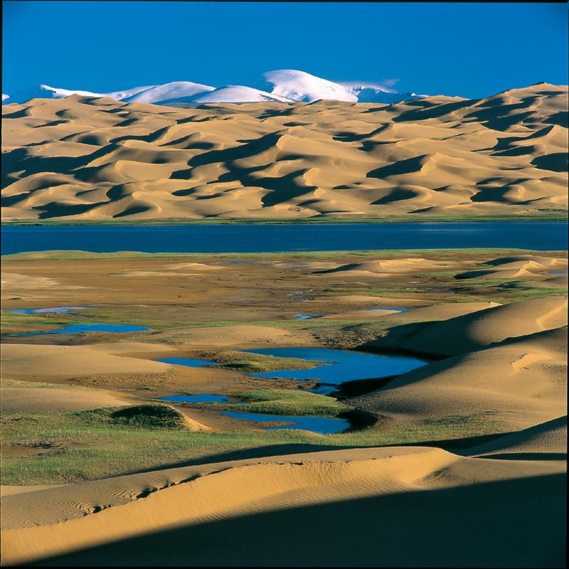 阿尔金山自然保护区里的沙漠奇观堪称一绝,其中尤以东北部的库木库里沙漠和鲸鱼湖东部的积沙滩新月形沙丘最为著称,海拔高度在3916至4706米之间,主要由高大的金字塔沙丘与复合形新月形沙丘组合而成。在鲸鱼湖以东的积沙滩新月形沙丘,海拔高度达4800至5000米,它们的高度比号称世界第一高程的南美洲阿塔卡玛沙漠还要高出2000米左右。毫无疑问,它是当今世界沙漠海拔高度之最。该沙漠掩埋了近代河床及冰积物,活动性较大,至今仍在堆积上升。沙丘底部潜水丰富,水依新月形沙丘而汇聚,集成月牙形水泊,名曰月牙泉。夏季形成小湖,碧兰清澈,冬季封冻结冰,白如银月,大可与敦煌鸣沙山的月牙泉争奇斗艳。库木塔格沙漠是野牦牛活动区,蓝天、黄沙、碧水和成群结队的野牦牛构成了阿尔金山自然保护区独特迷人的景观。