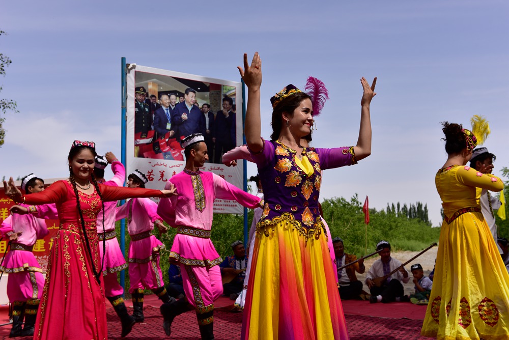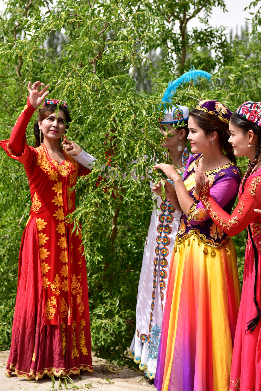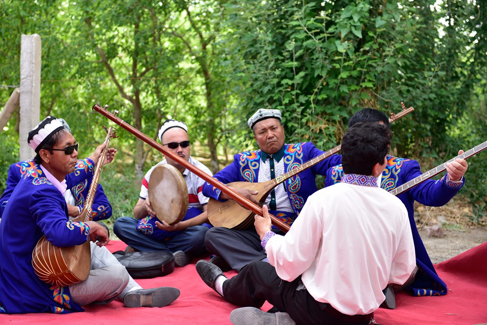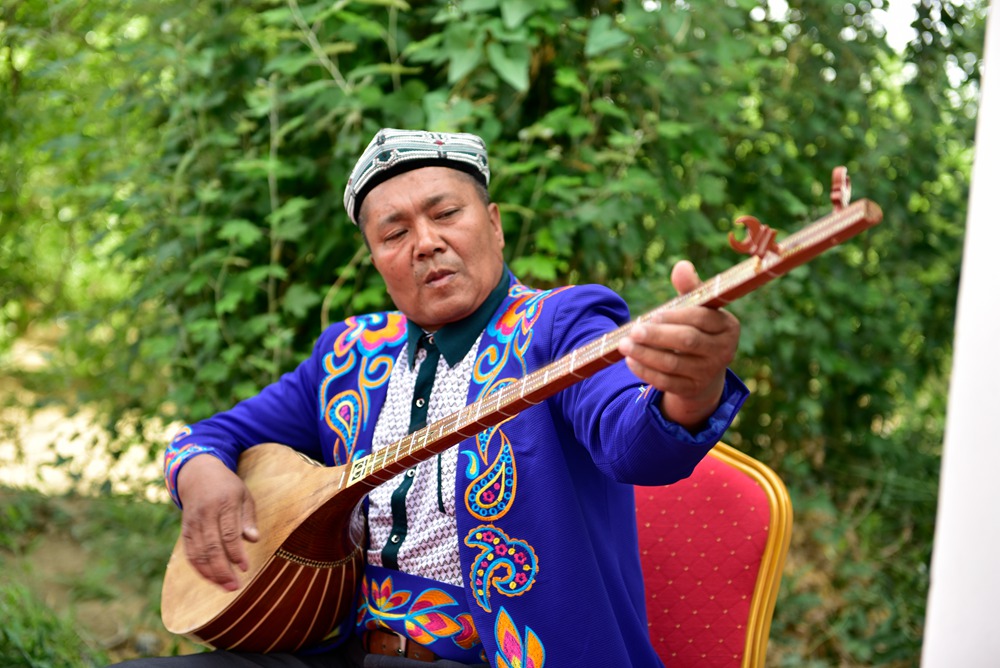 上图为“若羌赛乃姆”活动中 维吾尔大叔弹都塔尔