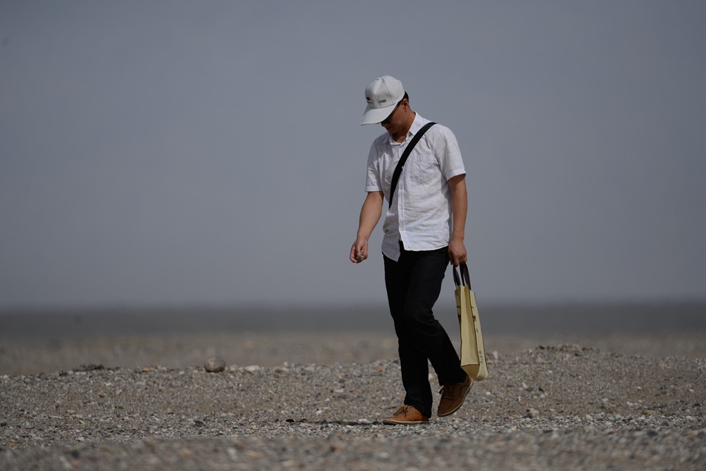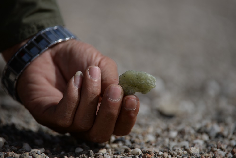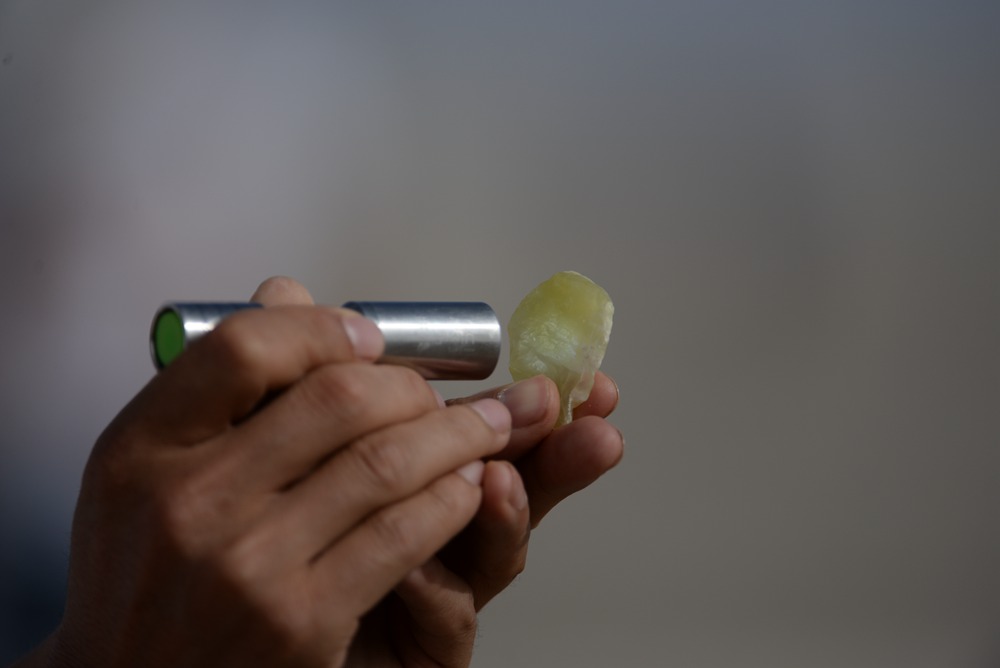 上图为一名游客强光手电筒来鉴别一下刚捡的玉石