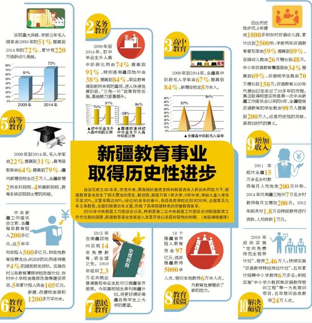 自治区成立60年来,在党中央、国务院的重视支持和新疆各族人民的共同努力下,新疆教育事业发生了翻天覆地的变化。解放前,新疆只有1所大学、9所中学,学龄儿童入学率不足20%,文盲率高达90%。经过60多年的奋斗,各级各类学校达到9230所,全面普及九年义务教育,全面扫除青壮年文盲,形成了具有新疆特色的完整教育体系。