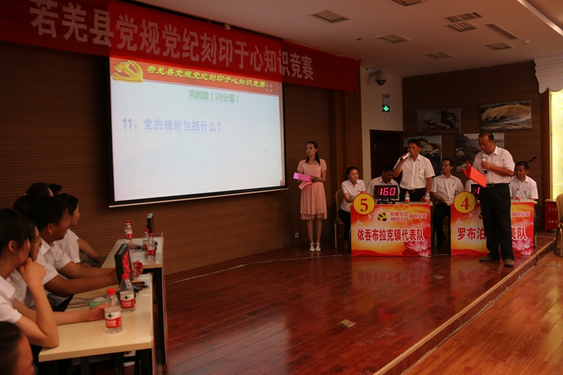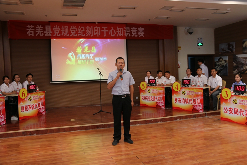为进一步增强各级党组织和全体党员党的意识、纪律意识、规矩意识和组织意识,把党章党规党纪刻印于心、落实于行。根据若羌县“纪律教育年”活动安排部署,6月16日下午,若羌县“党规党纪刻印于心”知识竞赛在楼兰博物馆三楼报告厅举办,县委常委、纪委书记阿吉•买买提出席活动并做讲话,吾塔木乡、县公安局等乡镇、县直党委等10支代表队参加比赛,县直相关单位100余名党员干部观看比赛。