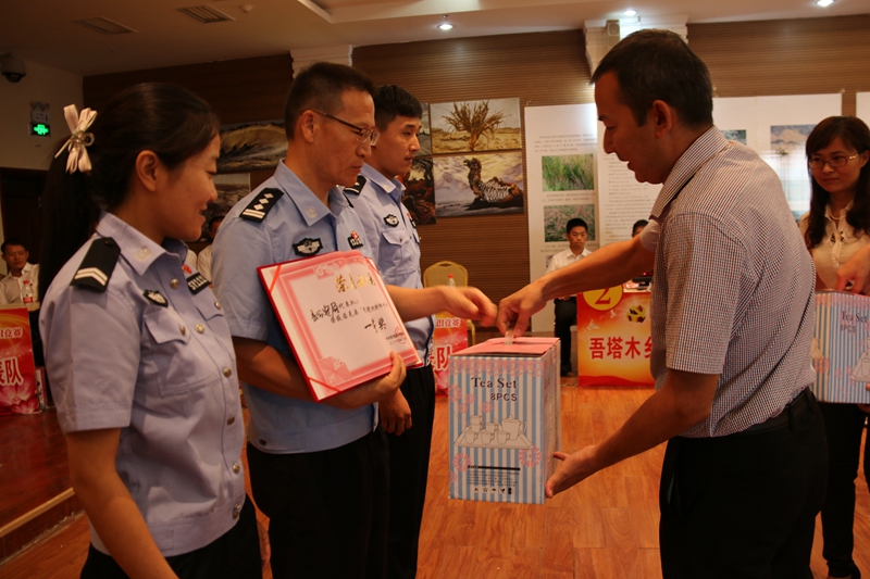 上图为县委常委、纪委书记阿吉·买买提为荣获一等奖的公安局党委代表队颁奖