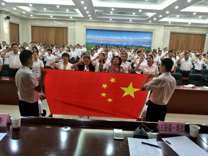 活动在奏唱国歌中拉开了序幕。县卫计委机关、县级医疗卫生机构、乡镇基层医疗机构共8名代表从不同的角度不同的认识进行发声亮剑。政府副县长古丽娜·肉孜带领全体干部进行宣誓,再次向社会表明我们广大卫生系统党员干部、医务工作者坚定与“三股势力”“两面人”作斗争的信心决心。
