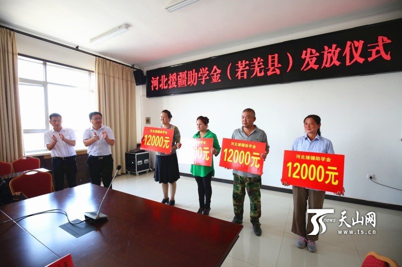 天山网讯(通讯员赵学龙摄影报道)8月23日下午,河北援疆助学金(若羌县)发放仪式在该县党政联合办公楼四楼会议室举行。当天,为全县符合受助条件的4名在内地高校就读的贫困家庭大学生发放了2016年、2017年援疆助学金4.8万元。