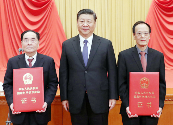 1月8日,国家科学技术奖励大会在北京人民大会堂隆重举行。中共中央总书记、国家主席、中央军委主席习近平向获得2017年度国家最高科学技术奖的南京理工大学王泽山院士(右)和中国疾病预防控制中心病毒病预防控制所侯云德院士(左)颁发奖励证书。(新华社记者 鞠鹏 摄)