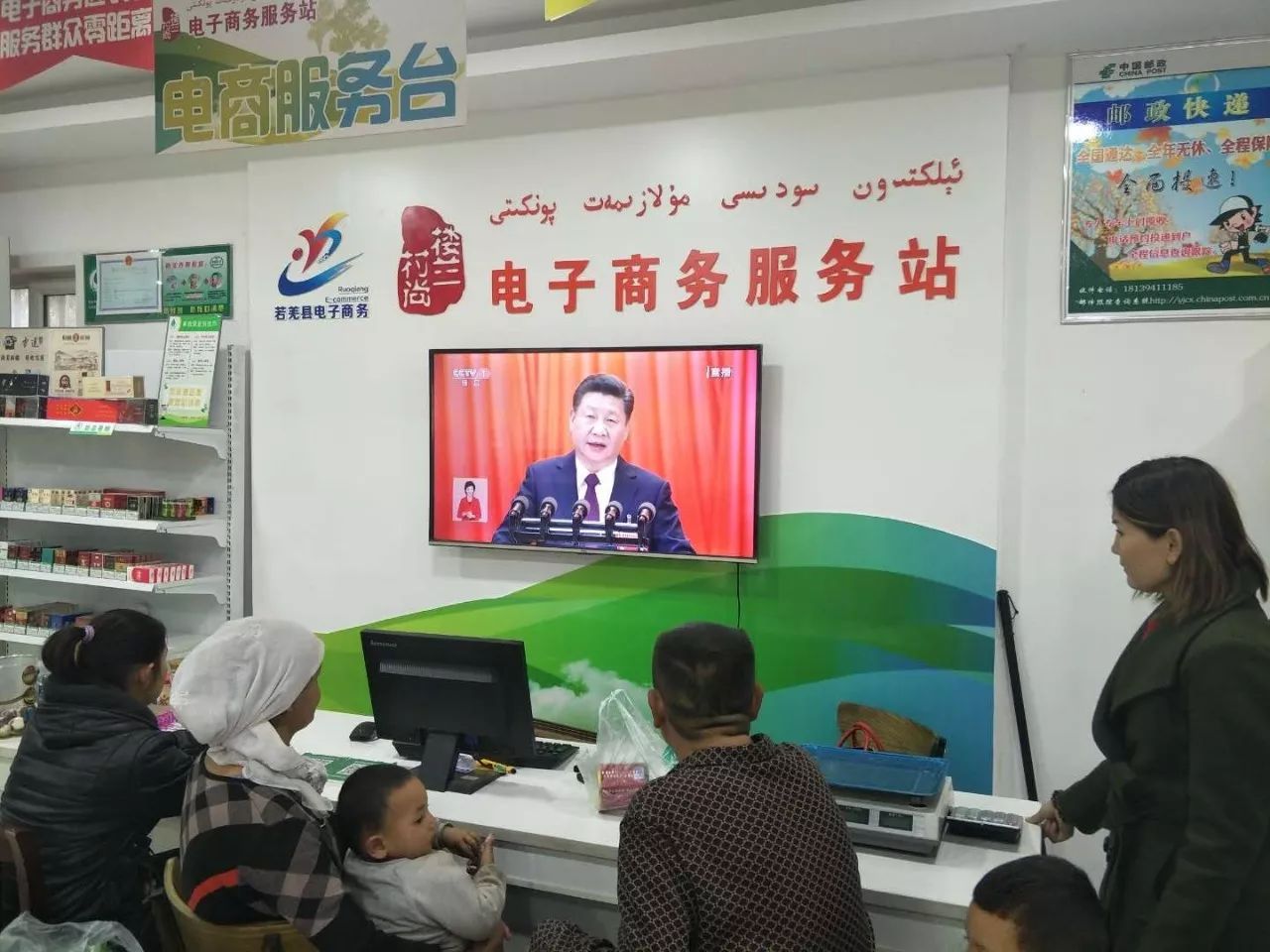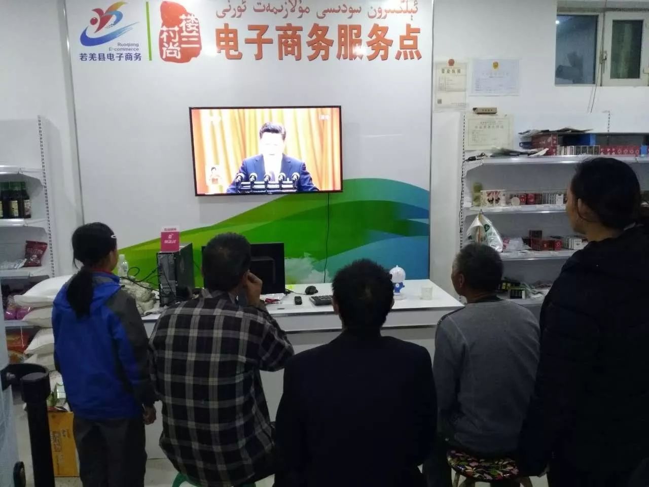 ? 若羌县铁干里克镇农村电商服务站里,村民们围坐在电视机下,认真的观看十九大的直播视频