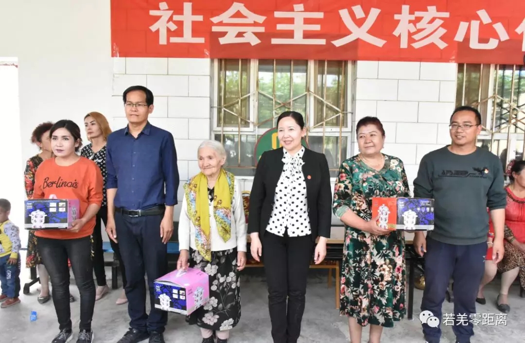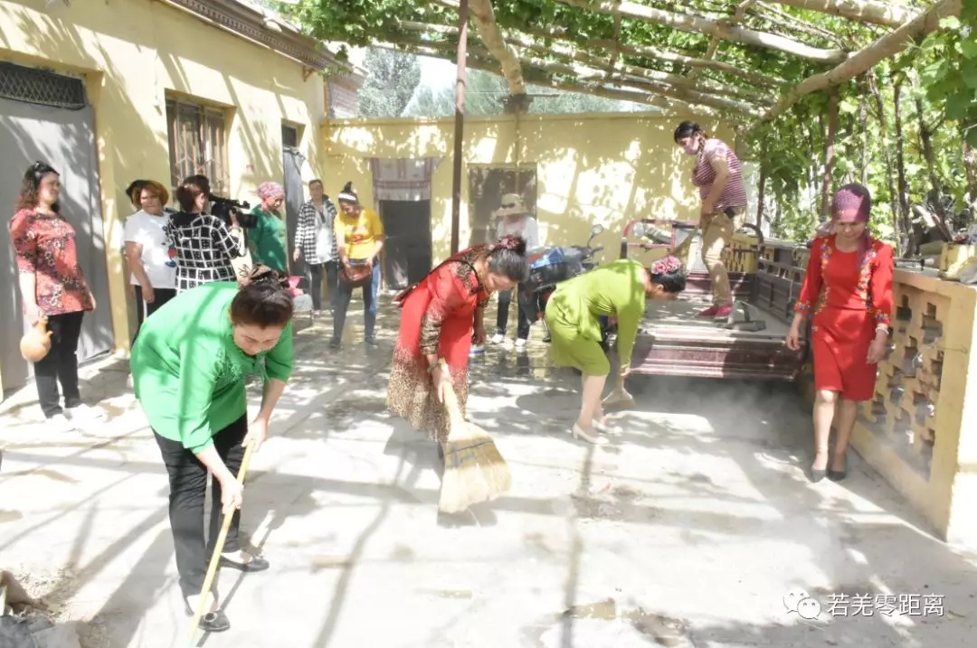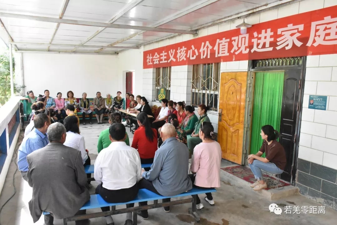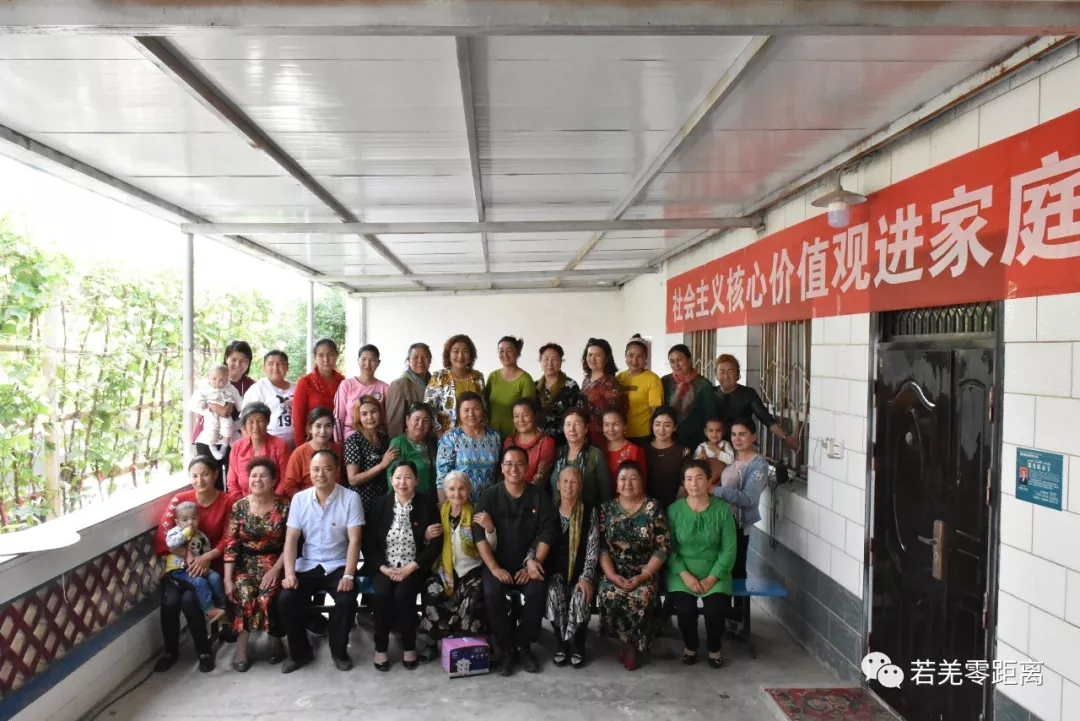 2018年5月5日,若羌县吾塔木乡果勒艾日克村村民库尔班·热合木家中妇女们齐聚一堂,县委组织部驻村工作队与村妇联组织村里各族妇女集中在这里开展“社会主义核心价值观进家庭”系列评选之最美庭院评选表彰活动。
