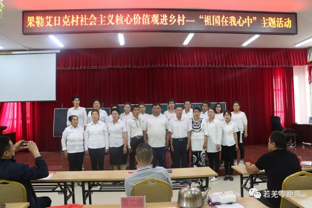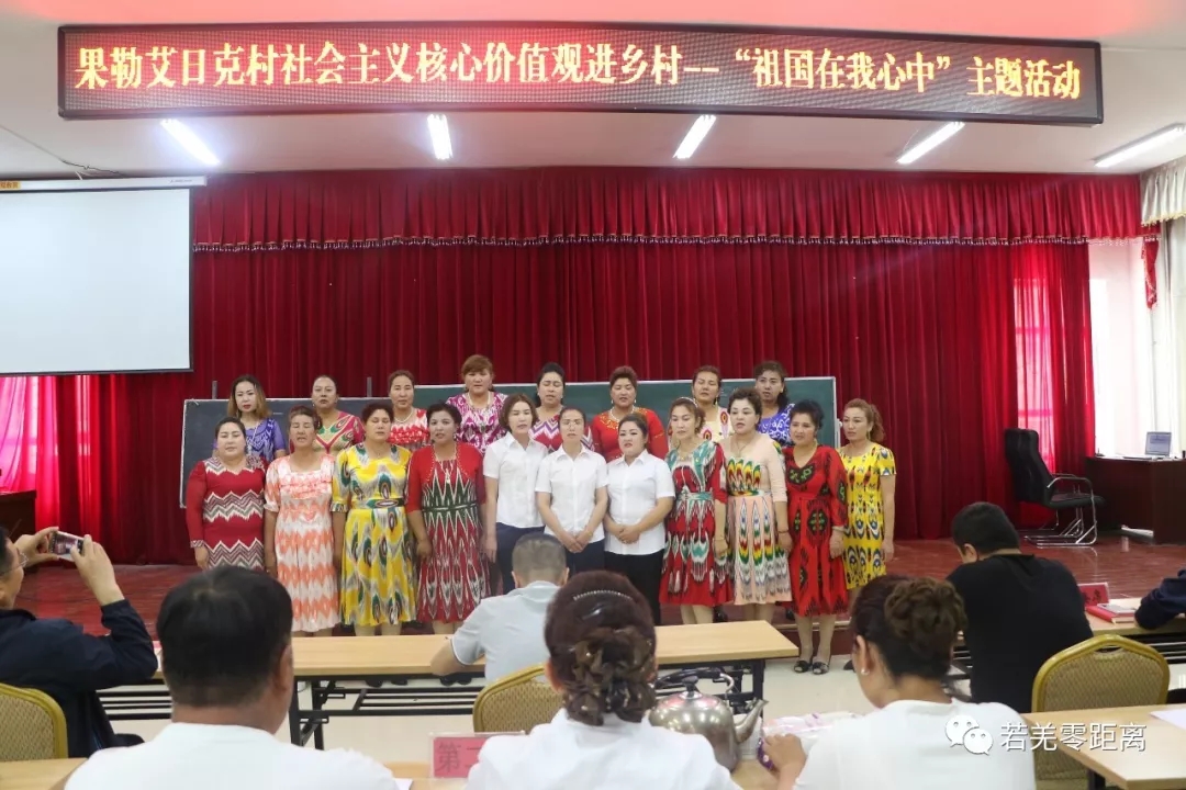 “起来,不愿做奴隶的人们…………”5月17日下午,若羌县吾塔木乡果勒艾日克村活动室里嘹亮的国歌声此起彼伏,舞台上穿着白衬衣和艾德莱丝裙的各族村民们正在激情满满的唱着国歌。